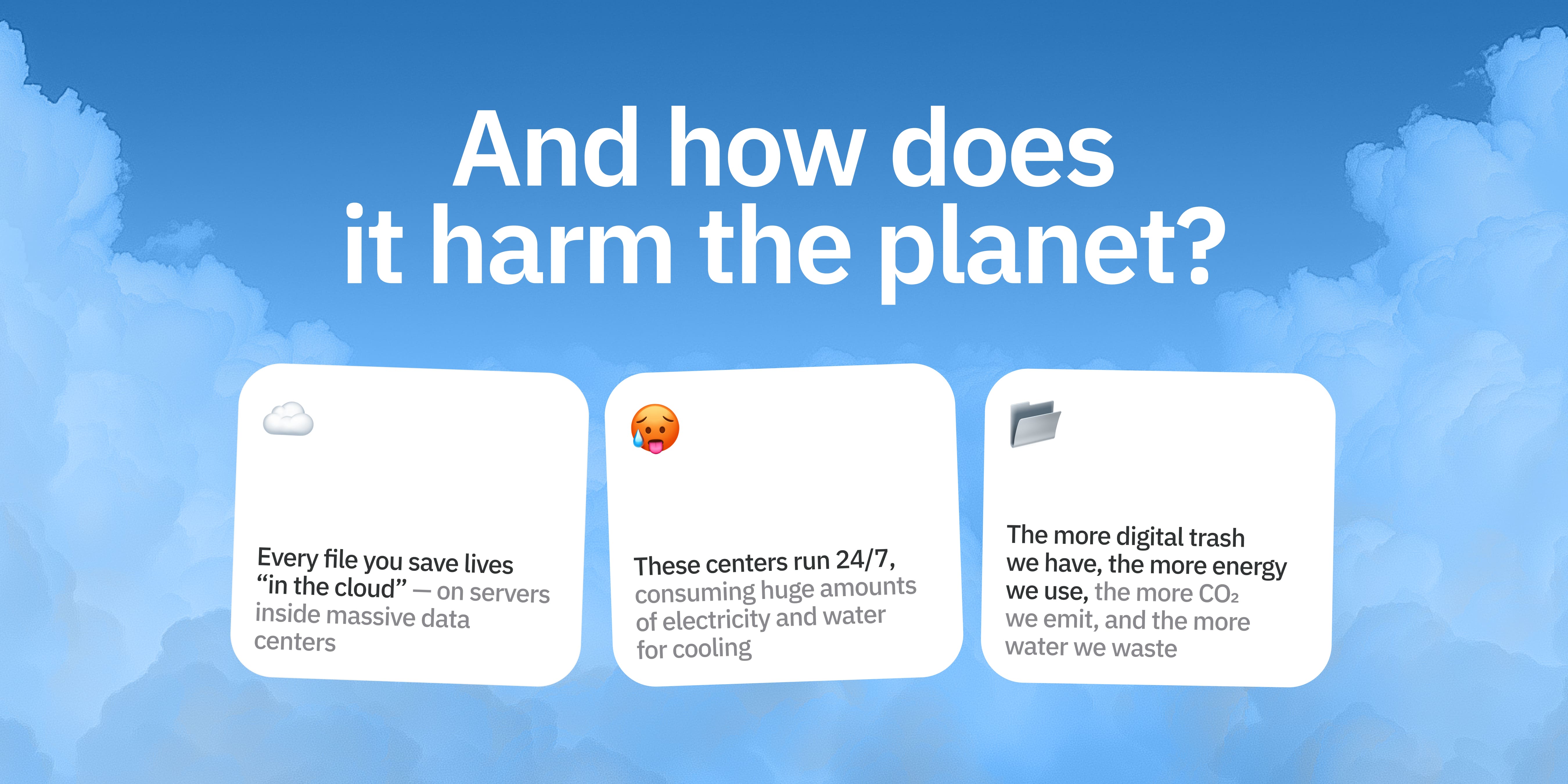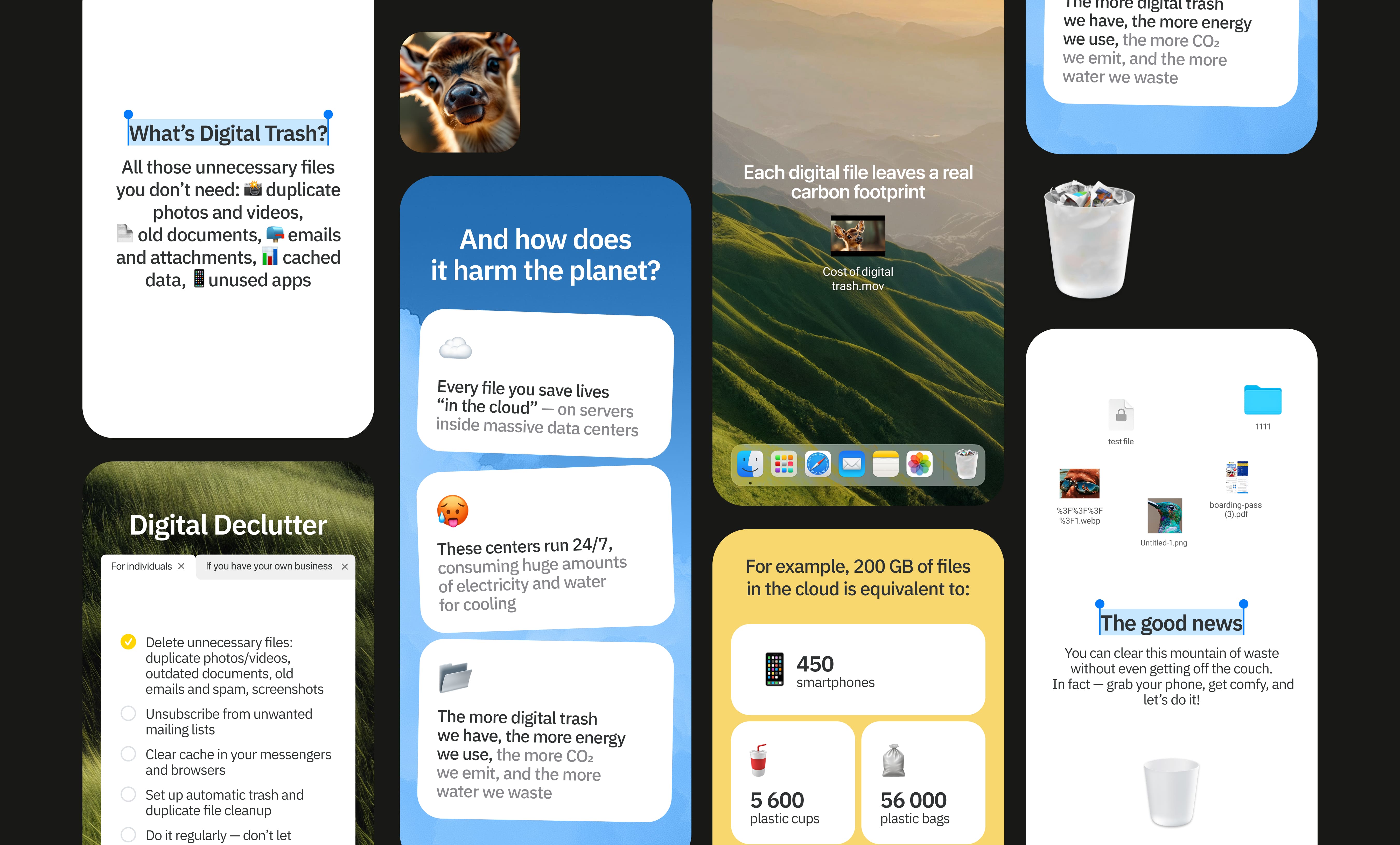 Readymag promo landing on “digital clutter” and its environmental impact, with motion narrative and a practical clean‑up checklist; the project is shortlisted by Berlin Commercial and created in collaboration with The07Studio.