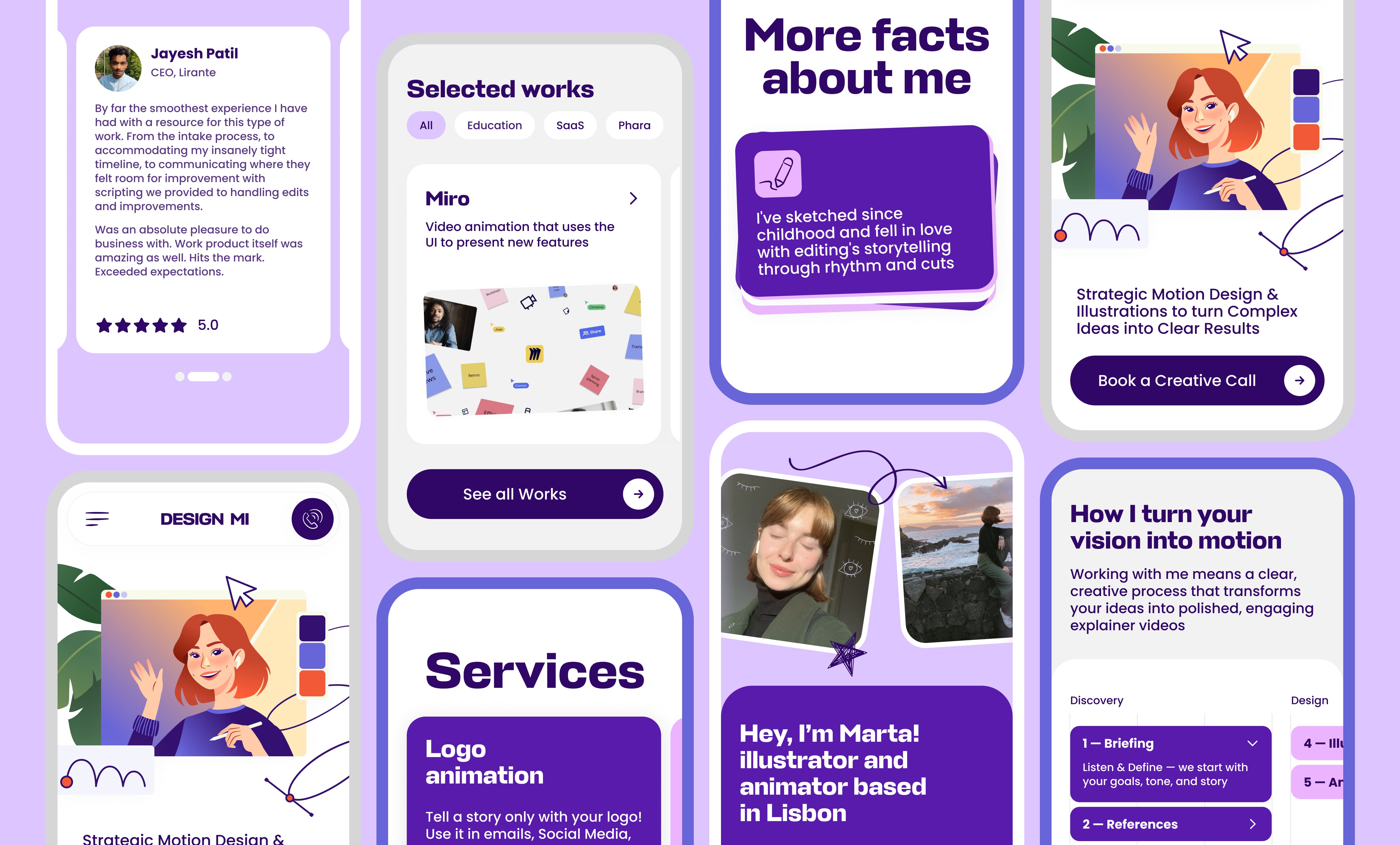 Redesign a portfolio website for a motion designer. Make the design reflect the designer's creativity, add more engaging blocks, and tell more about the designer's personality