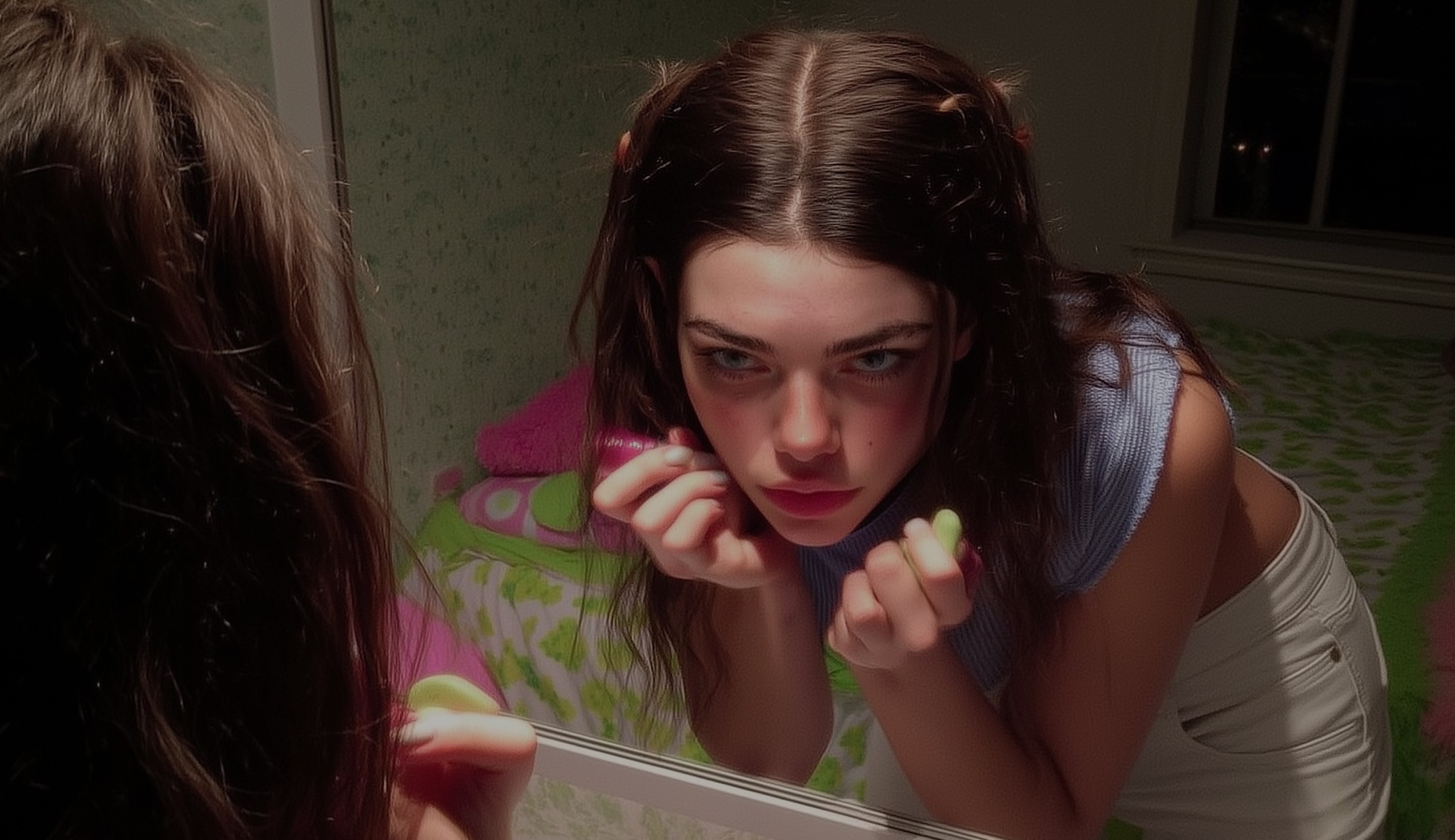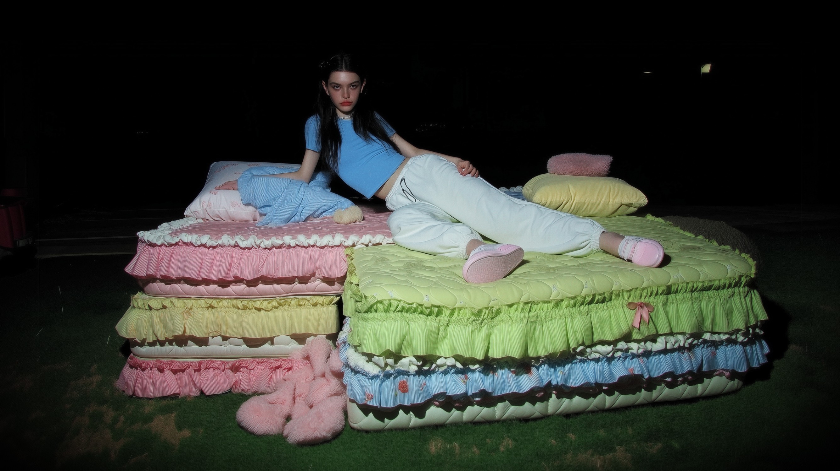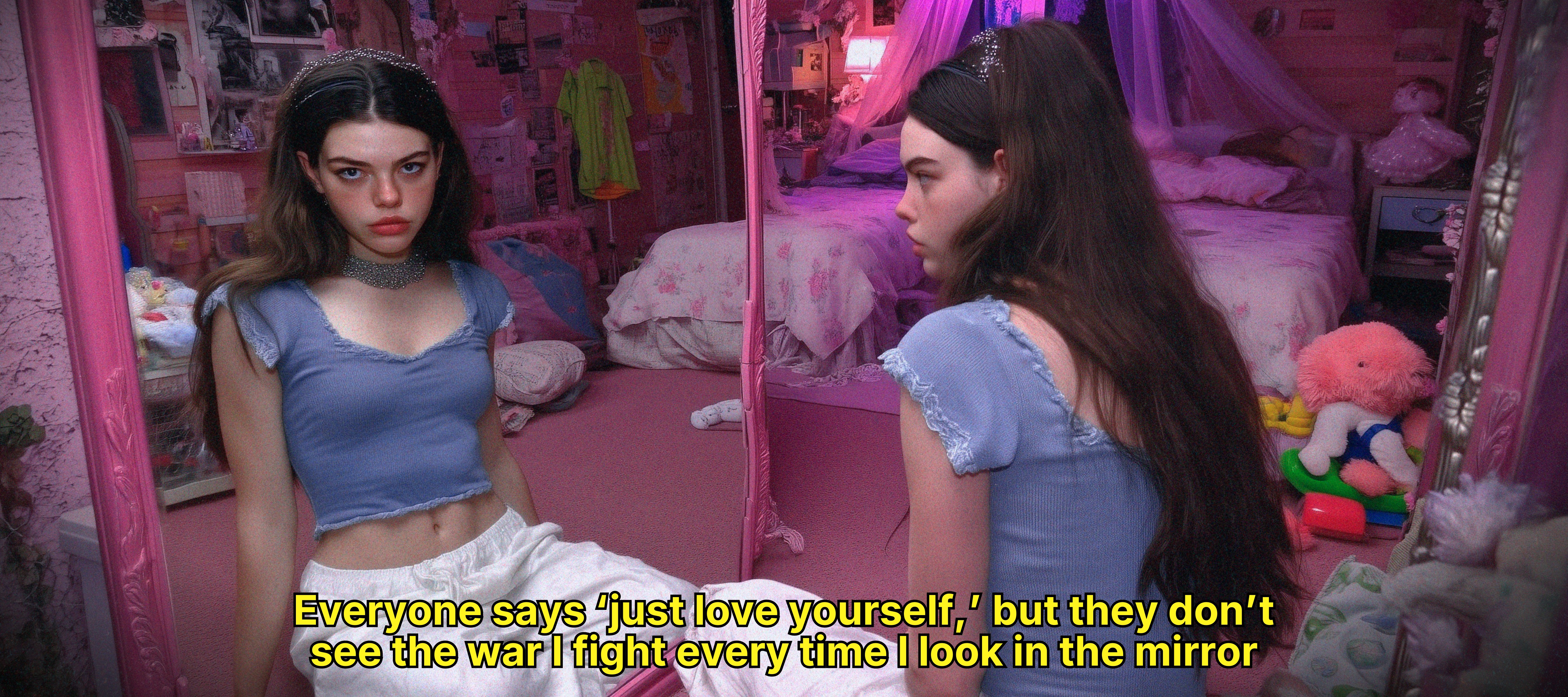 Liminal spaces reflect her inner landscape, while the ugly core aesthetic highlights the awkwardness of this tender age and the way emotions become larger than life